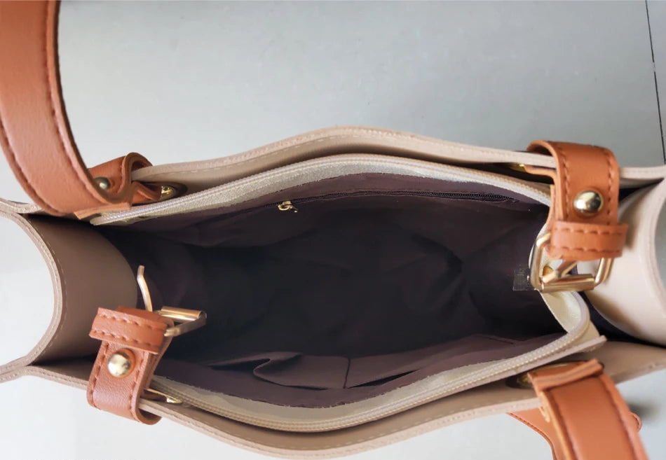 Where effortless elegance meets modern. The "Capri Luxe" tote is crafted in soft colors with rich tan leather straps and gold-tone hardware for a striking contrast. Its structured silhouette (H31cm x L27cm x W11cm) is elevated by a discreet exterior slit pocket - perfect for quick-access essentials. Spacious yet sleek, it's your ultimate everyday luxury.